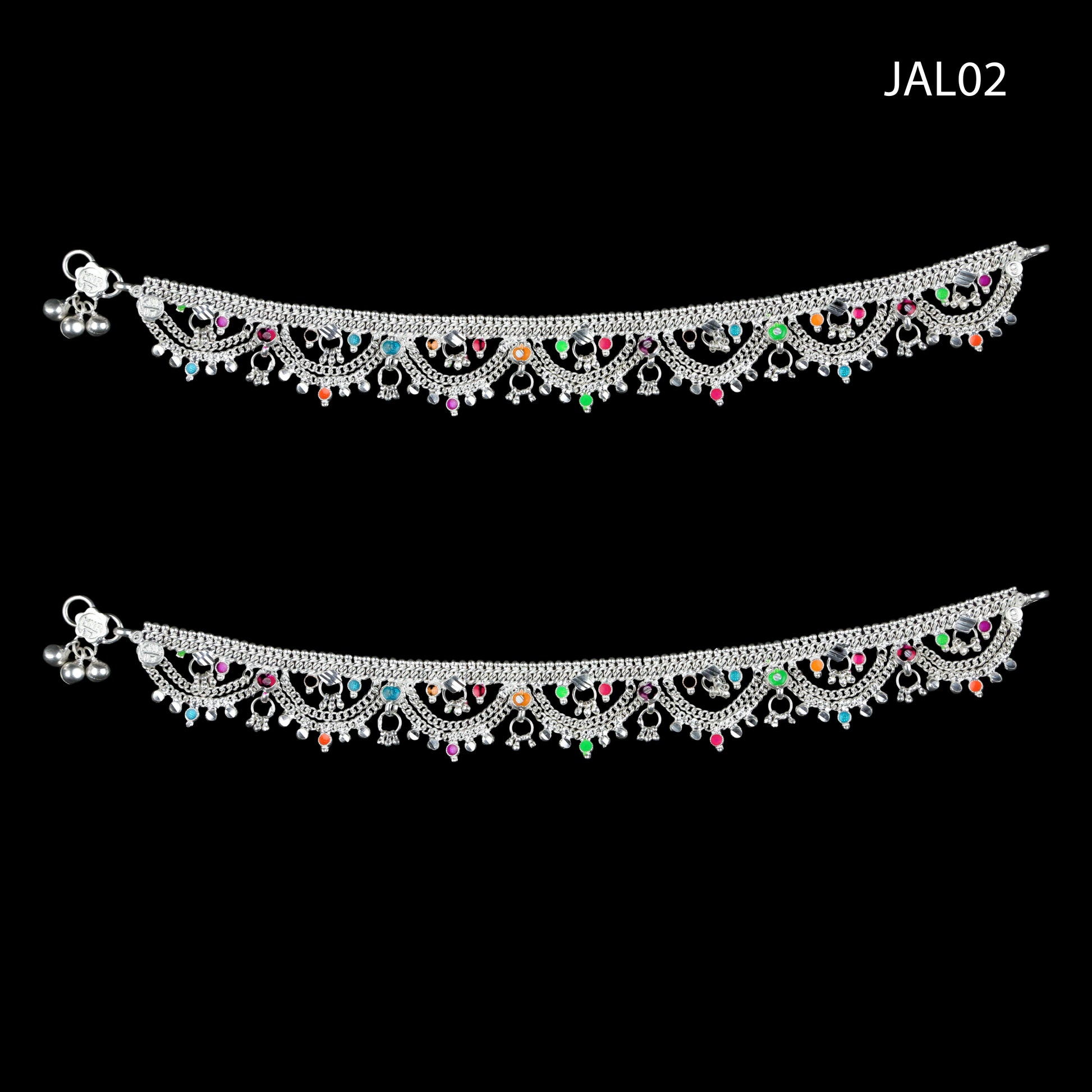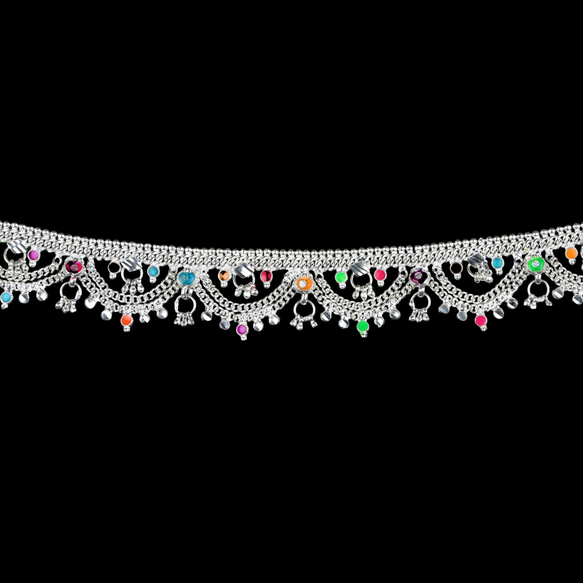 Graceful silver anklet with intricate patterns and colorful flower embellishments, perfect for a traditional elegant look.